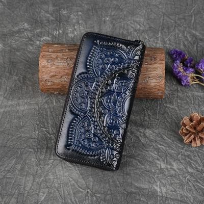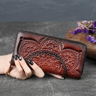رجعية محفظة محفظة حقيبة طويلة الطبيعة بقرة الجلد المصنوعة يدويا محفظة الأزهار المنقوش